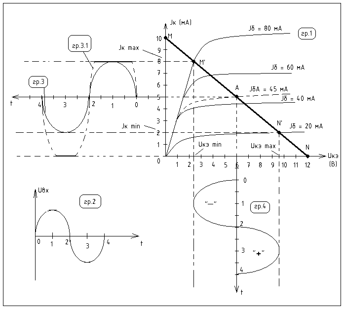 1-ый график – нагрузочная прямая MN и статические выходные характеристики. A -рабочая точка.