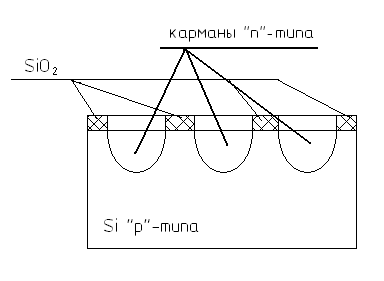 4) диффузия примесей, например, фосфор, сурьма, мышьяк при температуре = 1200оС – создается карман “n”-типа