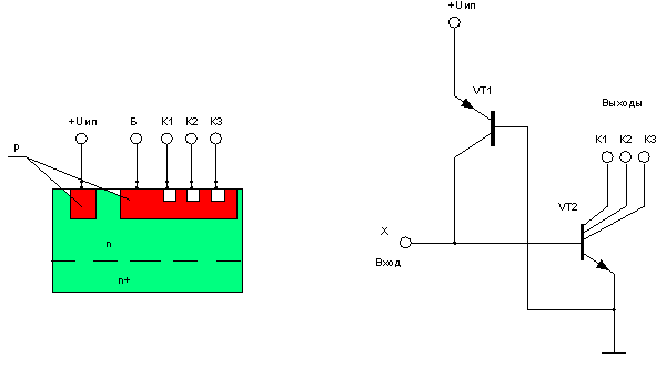 Структура проводимости и схема базового логического элемента И2Л показана на рисунке 53 и 54.