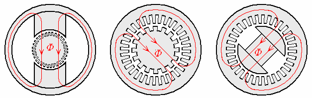 В синхронной электрической машине (рис. 2в) магнитное поле создается обмоткой возбуждения с постоянным током, расположенной на вращающейся части. При этом постоянное магнитное поле вращается вместе с якорем и взаимодействует с неподвижной трехфазной электрической обмоткой, находящейся на статоре синхронной машины.