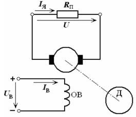Конструкция обмотки якоря такова, что все ее проводники соединены последовательно. При этом ЭДС всех проводников складываются и создают разность электрических потенциалов, которая через пластины коллектора и щетки подается к зажимам генератора. На зажимах обмотки якоря генератора создается напряжение U. Если к зажимам обмотки якоря генератора присоединить приемник электрической энергии с сопротивлением Rп , то образуется электрическая цепь, в которой под действием напряжения U возникает ток IЯ , который замыкается в приемнике. Таким образом, генератор постоянного тока, потребляя от приводного двигателя механическую энергию, отдает электрическую энергию электроприемникам во внешнюю электрическую цепь, т.е. преобразует механическую энергию в электрическую.