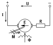 в магнитном поле под действием момента М проводниках обмотки якоря в соответствии с законом Фарадея наводится ЭДС вращения Е:
