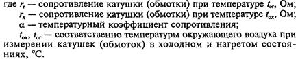 При определении температуры катушек (обмоток) методом сопротивления превышение температуры катушек (обмоток) над температурой окружающего воздуха определяют по формуле