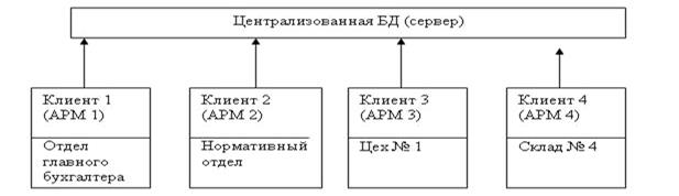 Пример. Пусть общая база данных (БД) БУИС хранится на сетевом сервере. Тогда согласно данной технологии для запуска программы печати журнала-ордера к счету "Касса" будут передаваться все проводки, среди которых нужно будет выбрать те, что касаются счёта "Касса". Если потребуются сведения о каком-либо основном средстве, то с сервера будет передан весь файл инвентарных карточек, среди которых следует отыскать нужную информацию. Если поступит запрос о начисленной заработной плате какого-либо сотрудника, то с сервера будет передан файл со всеми сотрудниками, в котором необходимо отыскать нужную запись.
