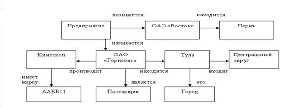 Это ориентированный граф, в узлах которого находятся имена объектов, а стрелки указывают на отношения между ними (рис.7.19). Из неизмеримого множества отношений часто используются часть-целое, свойства и функциональные связи (производит, находится и т.д.).