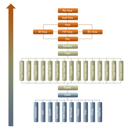 В реальной жизни часто встречаются вредоносные программы, которые обладают целым набором вредоносных функций и способов распространения. Возьмем для примера некую вредоносную программу, распространяющуюся по электронной почте в виде вложений и через P2P-сети в виде файлов. В дополнение к этому, «зловред» содержит функцию несанкционированного пользователем сбора адресов электронной почты с пораженных компьютеров. Таким образом, вредоносная программа может быть с равным успехом отнесена к Email-Worm, к P2P-Worm и к Trojan Mailfinder. Подобная ситуация, в конечном итоге, не вызовет ничего, кроме путаницы, т.к. различные модификации одной и той же вредоносной программы могут получить различные названия в зависимости от того, какому поведению отдаст предпочтение анализировавший код антивирусный эксперт.
