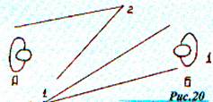 Этот принцип, пожалуй, один из самых важных, если ни самый важный для съемок сцен, в которых участвуют взаимодействующие между собой люди. Как правильно снять такую сцену? Как правильно расставить камеры в павильоне при съемке передач с количеством участников от двух до ста и более? Как создать для зрителя правильное представление о происходящих событиях? Начнем самого простого: как поставить камеры, чтобы два беседующих человека, снятых отдельными кадрами, на экране смотрели друг на друга ? Нарисуем мизансцену (план съемочной площадки). Мы поставим камеры на первую и вторую точки (рис.20). На экране получим такой результат (рис.21). Оказывается, зритель увидит, что оба собеседника смотрят в одну сторону... Но такого не может быть! Ну что ж, попробуем другой вариант. Поставим камеры так, чтобы одна снимала обоих, а другая - 1-й средний план того партнера, который с точки 1 окажется на экране спиной к зрителю. Снова показываем мизансцену (рис.22).