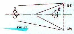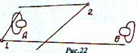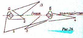 Если мы ведем съемку не одним статичным кадром, а несколькими, то мы, тем самым, в монтаже неизбежно создаем некое искусственное экранное пространство, конструируем его. И перед режиссером стоит задача создать такое воображаемое пространство, чтобы зритель осознавал его как целое и единственное. А главное - предоставил зрителю возможность без затруднении, без лишних умственных операций ориентироваться в нем, как каждый из нас это делает в жизни. В общем виде принцип монтажа двух кадров по ориентации в пространстве гласит: съемка двух объектов , взаимодействующих друг с другом, должна производиться строго с одной стороны от линии их взаимодействия (рис. 26).
