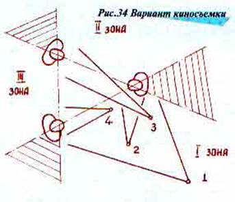 2-ой вариант. Панораму можно остановить даже раньше (рис.30), в мгновение, когда "злодей" Арбузов зайдет за спину стоящего на месте г-на Брюквина. Дать Арбузову выйти из кадра и остановить камеру. И опять продолжить съемку следующих кадров с учетом новой линии взаимодействия. Когда в сцене или событии участвуют два человека или два объекта, все достаточно просто. Но по мере увеличения количества действующих лиц соблюдать принцип ориентации в пространстве становится все сложнее и сложнее. Допустим, что беседу ведут три человека. Посмотрите на план съемочной площадки (рис. 31). Какие точки съемки выбраны ошибочно, из-за которых зритель может потерять ориентацию в пространстве, запутаться кто на кого смотрит в момент разговора? Обратите внимание: камеры на всех точках стоят по одну сторону от линии взаимодействия, т.е. - "правильно". Правда, в разговор между Арбузовым и Брюквиным встрял еще г-н Вермишелев. Если рассматривать съемку по требованиям старых учебников, то все точки соответствуют генеральной линии съемки, определенной камерой на точке № 1. Но попробуем перевести результаты такой съемки в раскадровку и проанализировать полученную монтажную последовательность (рис.32). Если кадры 1-й и 2-й соответствуют правильной трактовке сцены в пространстве, то 3-й явно противоречит изначальной ситуации. Арбузов, который в действительности смотрит на Брюквина, на экране в результате нашей съемки почему-то изменил объект своего внимания и общается с Вермишелевым. В самом деле, третий господин по фамилии Вермишелев подошел к двум нашим знакомым с самого начала разговора, но принять в нем участие никак не может. Брюквин упрямо не обращает на него внимания, хотя слышит его приветствия. Его взгляд прикован к Арбузову, который ест его глазами, доказывая свою правоту. Ошибка вскрывается просто, как только проводятся все линии взаимодействия между тремя участниками встречи (рис. 33). Точка 3-я оказалась за линией взаимодействия II -II по отношению ко всем остальным точкам съемки. Вопрос закономерен: как расположить камеры, чтобы на экране герои действовали также, как на съемочной площадке? Есть надежда, что вы, уважаемый читатель, уже достаточно овладели искусством воображения результата съемки, способны представить себе кадр и человека в нем, смотрящего в совершенно определенную сторону, если вам будет указано с какой точки идет съемка этого персонажа на плане съемочной площадки. Теперь для вас не составит труда ответить на поставленный вопрос. Конечно, в этом случае можно вести съемку из любой, но только одной зоны, кроме заштрихованных, и режиссеру можно не думать, зная этот принцип, о возможной монтажной ошибке (рис. 34).