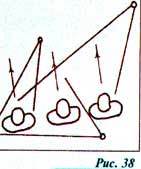Кадры 1, 2, 5, 8 и 10 сняты с точек, расположенных по одну сторону от линии взаимодействия "зал - оратор", а кадры 3, 4, 6, 7 и 9 - с точек, находящихся по другую сторону от этой линии. В таких случаях обычно пользуются самым простым приемом определения, куда должен быть направлен на экране взгляд того или другого персонажа. Для этого режиссер и оператор до съемки решают с какой стороны от линии взаимодействия они проведут всю съемку. Соответственно для этого направления съемки выставляется свет. А дальше - они следят за тем, чтобы взгляды членов президиума и оратора во всех кадрах были направлены так, как в первом кадре. В нашем примере - справа налево, а взгляды всех сидящих в зале, независимо от крупности плана и места, занимаемого слушателями, - слева направо. Соблюдать этот принцип весьма просто. Главное - не забывать, что взгляд оратора в любом снимаемом кадре должен быть направлен в левую сторону от камеры, а взгляды всех слушателей - только вправо от аппарата. Когда оператор ведет съемку, он всегда смотрит в визир и через него видит, в какую сторону от объектива направлен взгляд человека, которого он снимает: вправо от камеры или влево. Опытный режиссер тоже без труда, находясь рядом, по действиям оператора и направлению съемки может определить, будет ли снимаемый в данный момент кадр удовлетворять в монтаже требованиям принципа ориентации в пространстве или нет. И если оператор "заблудился" в создаваемом экранном пространстве, то откорректирует его работу с камерой (рис. 38 и 39).