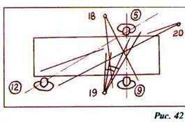 Действие, к примеру, (рис. 42) может развиваться так: 5-й вел спор с 9-м и для подтверждения своих аргументов обратился к 12-му. Камера в этот момент стояла как раз на точке № 19 между 9-м и 12-м. Во время съемки произошла переброска взгляда 5-го с одной стороны камеры на другую. В начале плана 5-й смотрел на 9-го вправо от камеры, а в конце кадра его взгляд оказался по левую сторону от объектива. Это случилось в кадре 19. Если мы вели съемку 5-го и 9-го, ориентируясь на их линию взаимодействия, то после перевода взгляда возникла новая линия взаимодействия между 5-м и 12-м.