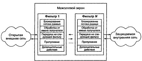 Фильтрация информационных потоков состоит в их выборочном пропускании через экран, возможно, с выполнением некоторых преобразований. Фильтрация осуществляется на основе набора предварительно загруженных в МЭ правил, соответствующих принятой политике безопасности. Поэтому МЭ удобно представлять как последовательность фильтров, обрабатывающих информационный поток (рис. 2).