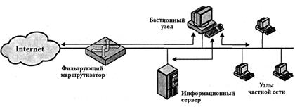 Если фильтрующий маршрутизатор в только что описанной конфигурации с одноточечным бастионным узлом будет скомпрометирован (т.е. его защита будет взломана), поток данных из Internet может пойти прямо через маршрутизатор в узлы внутренней частной сети.