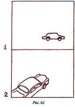 На изображенных схемах видно, что путь, который проделал автомобиль, чтобы пересечь кадр в первом случае, в три раза длиннее, чем во втором. При одной и той же скорости в кадре № 1 машина преодолеет расстояние от рамки до рамки за время чуть больше трех секунд, а в кадре № 2 - всего лишь за секунду. Но для зрителя расстояние от левой до правой границы экрана как бы одинаково, а время на покрытие кажущегося равным расстояния сократилось в три раза. Вот почему у сидящего перед экраном возникло впечатление, что во втором кадре автомобиль рванул в три раза быстрее. Кроме того, увеличение масштаба съемки, при котором корпус машины занял существенно большую часть площади экрана, только усугубит ощущение одномоментного возрастания скорости его движения. Но сами согласитесь, что такое в нашей действительности, где действуют законы инерции, случиться не может. На экране в результате такого стыка кадров возникнет ирреальная ситуация, и зритель не захочет поверить в достоверность дальнейших событий. И он имеет на это право, если режиссер не выполнил элементарных требований 5-го принципа стыка кадров непрерывно развивающейся сцены. Конечно, можно обеспечить комфортность восприятия, если дать возможность автомобилю выехать за рамку в первом кадре, но сохранить впечатление, что в действиях главного объекта ничего не изменилось, все равно не удастся. Что делать? Как поступать в подобных случаях, если известно, что принцип первый требует обязательного изменения крупности кадра? Ответ будет весьма прост. Чтобы выполнить требования сразу двух принципов межкадрового монтажа сцены (по крупности и по темпу) для обеспечения комфортности восприятия стыка кадров, необходимо путь движения машины при той же скорости движения во втором кадре сделать равным или почти равным тому, который автомобиль проделал в предыдущем кадре (рис. 61). Изменится мизансцена, поменяется и композиция. Фронтальное построение первого кадра сменится диагональным во втором. Такое изменение только придаст изящество монтажному рассказу и дополнительно улучшит комфортность восприятия стыка кадров. Смена планов для зрителя окажется "мягкой", а по смыслу действие будет дальше развиваться без непредусмотренных режиссером изменений (рис. 62).