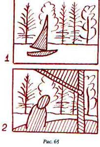 Второй вариант той же задачи: оба соседних кадра снимаются панорамой сопровождения. Объект по отношению к рамкам кадра почти неподвижен. Перемещается только фон относительно нашего главного объекта. Пусть таким объектом станет яхта и ее шкипер. Поставили камеру на точку первую и сняли яхту на фоне леса, панорамируя камерой по мере движения судна. Все замечательно. Камера стояла на берегу, удобство съемки было обеспечено. Но требуется снять второй кадр, в котором зритель увидит действия яхтсмена. Оператор быстренько переводит трансфокатор на максимально большое фокусное расстояние, существенно увеличивается крупность, по масштабу шкипер оказывается на втором среднем плане (рис. 63). А если идет телевизионная трансляция соревнований, то вторая камера с длиннофокусным объективом по расстановке режиссера просто стоит поблизости. Такой вариант существенно не изменит экранный результат. Анализируем. Яхта движется с неизменной скоростью. В первом кадре кусочек берега с двумя елками, а точнее говоря, условная точка у основания этих деревьев проплывет от правого до левого края экрана, допустим, за 10 секунд.
