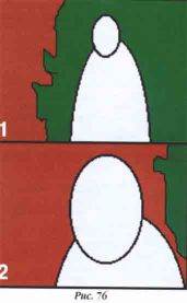 В первом кадре человек снят на фоне зелени. Он дает интервью. А во втором кадре - продолжение того же интервью без разрыва во времени, но почему-то совсем в другом пространстве, где нет и намека на зеленую растительность. Невольно у зрителя возникает вопрос: что произошло? Каким образом этот герой мгновенно "перелетел" в какое-то новое и при том страшное место, где все вокруг красно? Если посмотреть на рисунок 75, то впечатление действительно будет жутковатым. Именно такой эффект испытает зритель при восприятии этих кадров. А представьте себе, что во время интервью несколько раз меняются планы, снятые с этих двух точек, и результат покажется зрителю кошмарным бредом, созданным воображением авторов. Конечно, данный пример доведен до грани абсурда. Но подобные ошибки с резким изменением цветового фона от кадра к кадру встречаются в телевизионной практике сплошь и рядом. А решение этой задачи не имеет в себе никакой сложности. Поставьте камеры так, чтобы в первом кадре присутствовал на фоне кусок стены, а во втором - осталась бы часть кустов (рис. 76). В общей трактовке плавности перехода при изменении цветовых пятен от кадра к кадру существует одно простое правило: в предшествующем плане должно присутствовать пятно, которое занимает около одной трети площади в рамке кадра. Это послужит логичным и естественным оправданием для зрителя заполнения цветом всей площади следующего кадра. Зрительский глаз должен обязательно за что-то "зацепиться" в цветовом решении композиции, что-то "ухватить" в первом кадре, чтобы во втором для него не стало полной неожиданностью появление большого совершенно нового цветового фона или пятна (рис. 77).