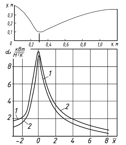 | Рис.7.2. Распределение значений коэффициентов теплообмена по тракту сопла Лаваля: р0=5МПа; 1 – расчет по (7.5); 2 – расчет по методике Бартца |