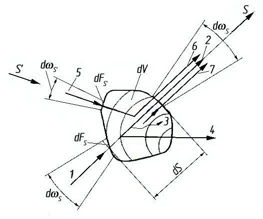 ; 6 - часть падающего излучения, рассеянная в направлении s; 7 – собственное (спонтанное) излучение объема в направлении s