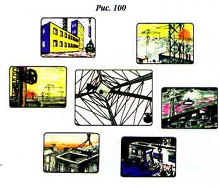 В раскадровках к фильму композиция из семи кадров выглядела, как на рис. 100. Такой она оказалась и на экране. В центре по часовой стрелке вращалась стрела башенного крана, снятая изнутри самой башни. Она "зажигала" одно за другим соседние изображения, повторяя маршрут движения солнца. Стройка шла до восхода,.. когда вставало солнце,.. в разгар дня,.. на закате,.. в сумерках и даже глубокой ночью. Так решались две главные профессиональные задачи режиссера. Но самым дорогим поликадром для Алексея Соколова остается композиция из фильма "Поступь грядущего". В 20-м веке человечество поставило локомотив своей цивилизации на рельсы прогресса и стремительно несется в будущее, совсем не зная каким оно окажется. По сути - оно несется в неизведанную, плохо прогнозируемую черноте. Мы, дети цивилизации, стремимся вперед, но не можем разглядеть, что же там за границей видимого, но и не можем остановиться. Луч прожектора локомотива освещает только небольшой кусок мчащегося на нас пути, даль скрыта от наших глаз. Задача выразить эту мысль режиссера в создании на формате широкого экрана поликадра, в котором трехмесячный младенец, едва подняв голову, непонимающе смотрит по сторонам и при этом как бы летит над рельсами, шпалами и стрелками в темноту (фото 8).