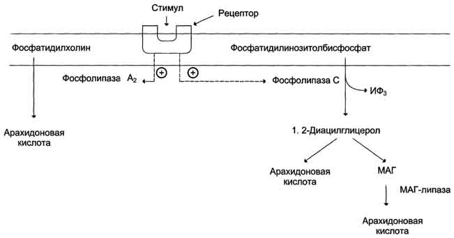 Рис. Отделение арахидоновои кислоты от глицерофосфолипидов. МАГ- моноацилглицерол; ИФ3- инозитолтри-фосфат.