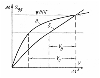 Выше было рассмотрено влияние различных условий на положение наиболее выгодной глубины сработки водохранилища, имеющего определенную собственную характеристику. Но сравнивая между собой различные водохранилища, нетрудно убедиться, что предельная глубина их сработки при одинаковых прочих условиях зависит от вида их характеристик — объемных и энергетических. Для примера на рис. 3 построены объемные характеристики двух водохранилищ, имеющих одинаковый полный объем при одинаковой отметке НПУ. Из этого графика видно, что при отмеченной на чертеже глубине сработки полезный объем водохранилища А составляет большую часть всего его объема. Для водохранилища Б при той же глубине сработки полезный объем составляет лишь небольшую часть всего полного объема водохранилища. Дальнейшее углубление сработки заметно увеличивает его полезный объем и, следовательно, дает большой энергетический эффект, в то время как для водохранилища А углубление сработки лишь очень мало увеличивает регулируемый расход воды.