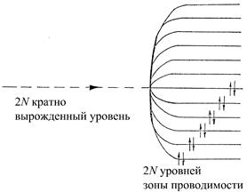 Рассмотрим далее образование металла из невзаимодействующих атомов на примере простой модели. Пусть в атоме имеется один валентный электрон на соответствующем уровне энергии. Этот уровень будет двукратно вырожденным, поскольку энергия электрона не зависит от ориентации его спина. В системе, состоящей из N невзаимодействующих атомов соответствующий уровень будет 2N кратно вырожден. При сближении атомов и установлении между ними взаимодействия, снимающего вырождение, уровень распадается на 2N уровней, образующих полосу. Половина этих уровней энергии будет занята парами электронов с противоположно направленными спинами, как это показано на рис. 1.2. Таким образом возникает зона проводимости, в которой электроны могут изменять свое состояние под внешним воздействием, занимая выше лежащие свободные энергетические уровни. Если, например, приложено электрическое поле, то электроны приобретут дополнительную скорость вдоль поля и, соответственно, энергию, будет осуществляться перенос электрического заряда, т.е. течь электрический ток.