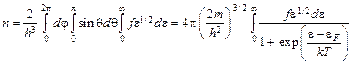 где F энергия Ферми, k константа Больцмана, Т температура электронов в градусах Кельвина. Суммируя фазовую плотность частиц по всем возможным значениям импульса (связь f с импульсом определяется посредством зависимости энергии от импульса согласно формуле (1.1)), находим концентрацию частиц n (количество частиц в единице объема)