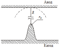 1) Параболическая аппроксимация. Катодное острие представляют в виде параболоида вращения с радиусом кривизны при вершине rэ. Анод – конфокальный гиперболоид с радиусом R. Напряженность поля на вершине острия