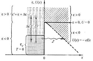 Возможна также эмиссия электронов и без предварительного возбуждения. Такой тип эмиссии мы уже изучали. Действительно, если вне тела вблизи его поверхности имеется силовое электрическое поле, тянущее электроны от границы тела, то потенциальная энергия электрона в этом поле будет убывать с расстоянием от поверхности. Эмиссия электрона при этом не требует предварительного возбуждения его, а осуществляется туннельным переходом. Аналогичная ситуация имеет место, если вблизи поверхности тела находится положительный ион, создающий кулоновскую потенциальную яму в эту яму электроны тела могут переходить также путем туннельного эффекта. Этот класс эмиссии будем называть эмиссией без предварительного возбуждения.