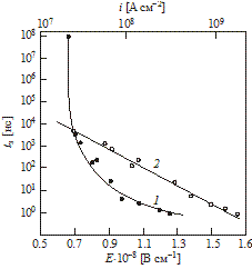 Рис. 12.2. Зависимости времени запаздывания взрыва автоэмиттера из вольфрама от напряженности электрического поля (1) и от плотности тока (2)