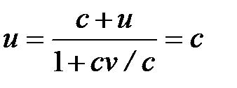 Релятивистский закон сложения скоростей подчиняется второму постулату Эйнштейна. Действительно, если и' = с, то формула (2.9) примет вид
