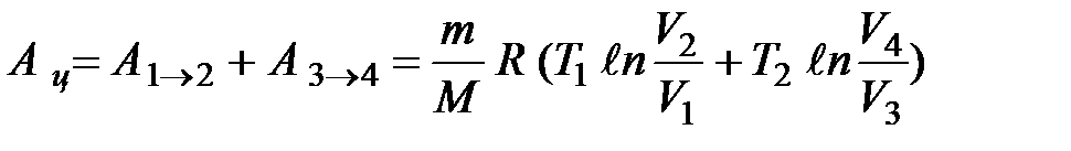 Работа цикла Карно равна алгебраической сумме работ, совершаемых машиной во всех процессах, из которых состоит цикл, т.е.