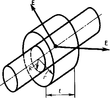 Из соображений симметрии следует, что линии напряженности будут радиальными прямыми, перпендикулярными поверхности нити. В качестве замкнутой поверхности выделим коаксиальный с заряженным цилиндр радиуса r и длиной l. Поток вектора Е сквозь торцы коаксиального цилиндра равен нулю (торцы параллельны линиям напряженности), а сквозь боковую поверхность