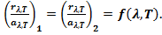 В состоянии термодинамического равновесия у тел, обменивающихся энергией лишь путем излучения и поглощения, отношение спектральной плотности энергетической светимости (испускательной способности) к поглощательной способности является величиной постоянной, не зависящий от природы тела. Для всех тел оно выражается одной и той же функцией длины волны и температуры: