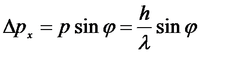 До прохождения через щель электроны двигались вдоль оси Y, поэтому составляющая импульса рx, =0, так что ∆ рx = 0, а координата Х частицы является совершенно неопределенной. В момент прохождения электронов через щель их положение в направлении оси Х определяется с точностью до ширины щели, т. e. с точностью х. В этот же момент вследствие дифракции электроны отклоняются от первоначального направления и будут двигаться в пределах угла 2 ( φ — угол, соответствующий первому дифракционному минимуму). Следовательно, появляется неопределенность в значении составляющей импульса вдоль оси X, которая, как следует из рис. 1 и формулы (1 ), равна