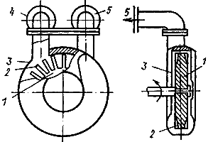 Рабочим органом вихревого насоса является рабочее колесо 1 с радиальными или наклонными лопатками (рисунок6), помещенное в цилиндрический корпус с малыми торцевыми зазорами. В боковых и периферийной стенках корпуса имеется концентричный канал 2, начинающийся у всасывающего отверстия и кончающийся у напорного. Канал прерывается перемычкой 4, служащей уплотнением между напорной и всасывающей полостями. Жидкость поступает через всасывающий патрубок 5 в канал, прогоняется по нему рабочим колесом и уходит в напорный патрубок 3.