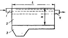 Рис 11.1. Схема горизонтальной песколовки: 1 – входной патрубок; 2 – корпус песколовки; 3–шламосборник; 4–выходной патрубок
