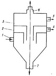 На рис. 11.4 представлена схема напорного гидроциклона, обеспечивающего очистку сточной воды и от твердых частиц, и от маслопродуктов. Сточная вода через установленный тангенциально по отношению к корпусу гидроциклона входной трубопровод 1 поступает в гидроциклон. Вследствие закручивания потока сточной воды твердые частицы отбрасываются к стенкам гидроциклона и стекают в шламосборник 7, откуда они периодически удаляются. Сточная вода с содержащимися в ней маслопродуктами движется вверх. При этом вследствие меньшей плотности маслопродуктов они концентрируются в ядре закрученного потока, который поступает в приемную камеру 3, и через трубопровод 5 маслопродукты выводятся из гидроциклона для последующей утилизации. Сточная вода, очищенная от твердых частиц и маслопродуктов, скапливается в камере 2, откуда через трубопровод 6 отводится для дальнейшей очистки. Трубопровод 4 с регулируемым проходным сечением предназначен для выпуска воздуха, концентрирующегося в ядре закрученного потока очищаемой сточной воды.