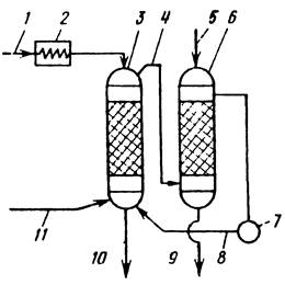 1– трубопровод подачи исходной сточной воды; 2– теплообменник; 3– эвапорационная колонна; 4– трубопровод загрязненного пара; 5–трубопровод подачи растворителя; 6–колонна с насадками из колец Рашига для очистки отработанного пара; 7– ентилятор; 8– трубопровод повторно используемого очищенного пара; 9 – трубопровод отвода загрязненного летучими примесями растворителя; 10–трубопровод отвода очищенной сточной воды; 11–трубопровод подачи свежего пара