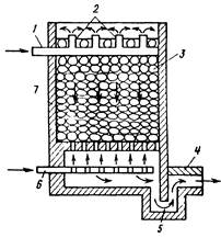 1–трубопровод подачи исходной сточной воды; 2–водораспределительные устройства; 3– фильтровальная загрузка; 4–трубопровод отвода очищенной сточной воды; 5–гидравлический затвор; 6 – трубопровод подвода сжатого воздуха; 7 – корпус фильтра