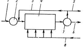 1 – трубопровод подачи исходной сточной воды; 2–первичный отстойник; 3– трубопровод подачи активного ила для повторного использования; 4–аэротенк; 5– трубопровод отвода отработанного ила; 6–трубопровод отвода очищенной сточной воды; 7– вторичный отстойник; 8-–трубопровод подвода сжатого воздуха