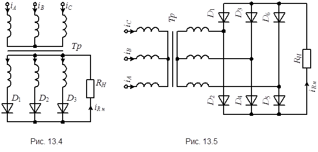 На рис. 13.4 приведена схема трехфазного однополупериодного выпрямителя. В ее состав входят трехфазный трансформатор, три диода и сопротивление нагрузки Rн. Каждая фаза вторичной обмотки трансформатора включена на общую нагрузку и соответствующий диод. Поэтому каждый диод открывается во время положительной полуволны своей фазы. Огибающая выпрямленного напряжения представляет три пульсации на интервале одного периода входного напряжения, т.е. m = 3, а: