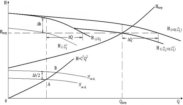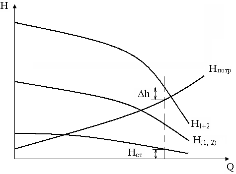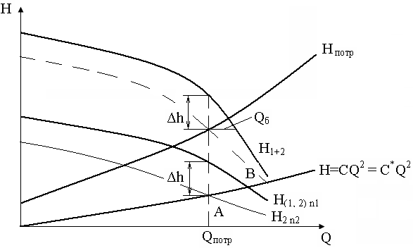 Рисунок 51 – Регулирование двух одноступенчатых насосов