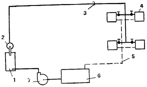 1 – паровой котел; 2 – паросборник; 3 – паропровод; 4 – нагревательный прибор; 5 – конденсатопровод; 6 – бак для сбора конденсата; 7 - насос