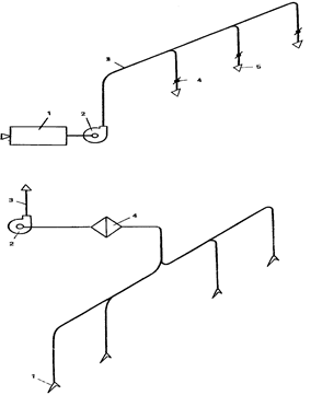 1 – приточная камера; 2 – вентилятор; 3 – воздуховод; 4 – дроссель-клапан; 5 - воздухораспределитель