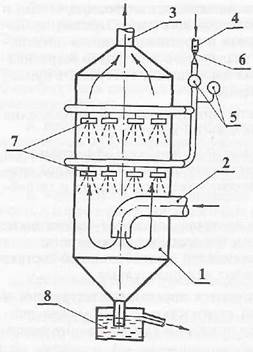 1– цилиндрический корпус; 2 – входной патрубок; 3 – патрубок для отвода очищенного газа; 4 – подвод воды на орошение; 5 – контрольно-измерительные приборы параметров воды; 6 – регулирующая задвижка; 7 – форсунки верхнего и нижнего яруса орошения; 8 – гидрозатвор