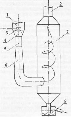 1– вход очищаемого газа; 2 – выход очищенного газа; 3 – орошающее устройство; 4 – конфузор трубы Вентури; 5 – горловина; 6–диффузор; 7 – каплеуловитель; 8 –гидрозатвор