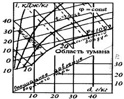 На оси абцисс отложены значения d, г/кг. На диаграмму нанося линии d=const, идущие вертикально, i=const (под углом 135° к оси ординат), φ=const, tc=cons , tм=const.