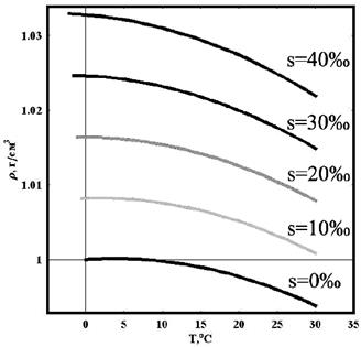 Морская вода, плотность – отношение массы единицы объема морской воды при температуре, которую она имела в море, к массе такого же объема дистиллированной воды при температуре 4°С. Это определение, принятое в океанологии, отличается от используемого в технике. Но поскольку плотность дистиллированной воды при 4°С равна 1 г/см3 (1000 кг/м3), то плотность морской воды численно равна плотности ее в общепринятом понимании и имеет ту же размерность. Для определения плотности морской воды обычно пользуются океанологическими таблицами.