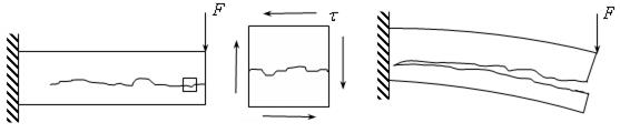 Иногда балки разрушаются расслоением (рис.15.24). Это происходит потому, что некоторый малый элемент получает трещину, параллельную оси балки. Рассмотрим изгиб балки под действием поперечной силы и исследуем малый элемент в области центра тяжести (рис.15.24).
